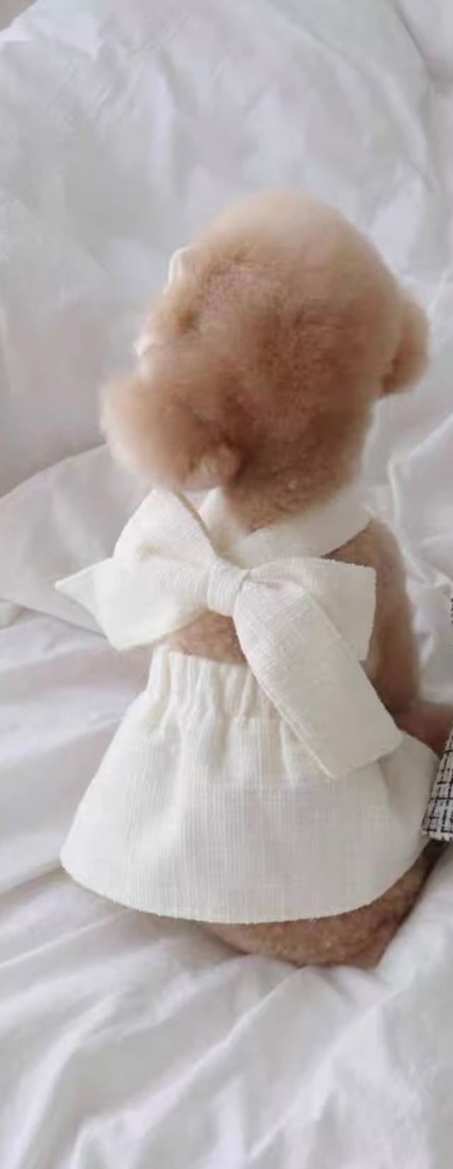 やわらかい風合いのホワイト生地に、繊細なレースとフリルをあしらった上品なドッグウェアです。 ナチュラルで清楚な印象ながら、さりげない可愛らしさも感じられるデザイン。 軽く通気性のある素材なので、リラックスタイムやお散歩やお出かけにも快適です。 背中のフリルがふんわりと動き、写真映えも抜群。 ボタンで簡単に着脱できるので、日常使いにも便利です。 ナチュラルテイストのお部屋やおしゃれな撮影にもよく似合う一着です。 【カラー】 ホワイト(やさしいオフホワイト) 【素材】 コットンブレンド(通気性が良く肌触りのよい素材) 【サイズ】 S:胸まわり35cm 着丈24cm M:胸まわり40cm 着丈28cm L:胸まわり45cm 着丈33cm 平置きの為 多少の誤差はご了承下さい。 【おすすめポイント】 ・軽くて柔らかい素材で着心地がやさしい ・レースとフリルが上品でかわいい印象 ・お出かけや撮影用にもおすす♪